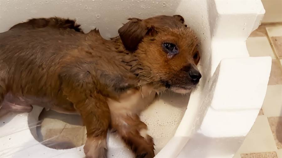 男性は温かい風呂を用意し、子犬を丁寧に洗いました。途中で、彼は子犬が静かに泣いているのに気づきました。もしかしたら、初めての救いに喜んで泣いたのかもしれないし、人間の優しさに感謝して涙を流しているのかもしれません。